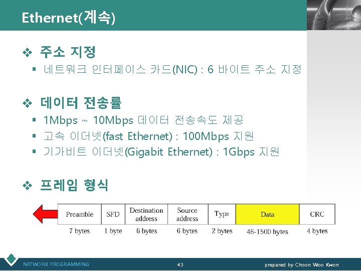 Ethernet(계속) LOGO v 프레임 필드 § Preamble & SFD(Start-of-Frame-Delimiter) • • Preamble : 수신측에 프레임 도착을 통지 SFD : 프레임 시작을 알림 시스템 타이머(timer) 동기 맞춤(synchronization) 8 octets : 7 octets (‘ 0101’) + 1 octet (‘ 11010101’) ⇒ ‘ 01010101 ∙∙∙∙ 11010101’(8 octets) ü Preamble : 15 nibbles of ‘ 0101’ ü SFD : 1 nibble of ‘ 1101’ ü 마지막 octet 경우 low 4 -bit nibble(‘ 0101’) 먼저 전송된 후 high 4 -bit nibble이 전송됨 § Destination/Source address : 수신지/발생지 물리주소 § Type : 프레임에 포함된 데이터의 유형 지정 • IPv 4(0 x 0800), IPv 6(0 x 86 DD), ARP(0 x 0806), RARP(0 x 8035) § Data : 상위층으로부터 받은 데이터(46~1, 500바이트) § CRC(Cyclic redundancy check) : 오류 검출 NETWORK PROGRAMMING 44 prepared by Choon Woo Kwon