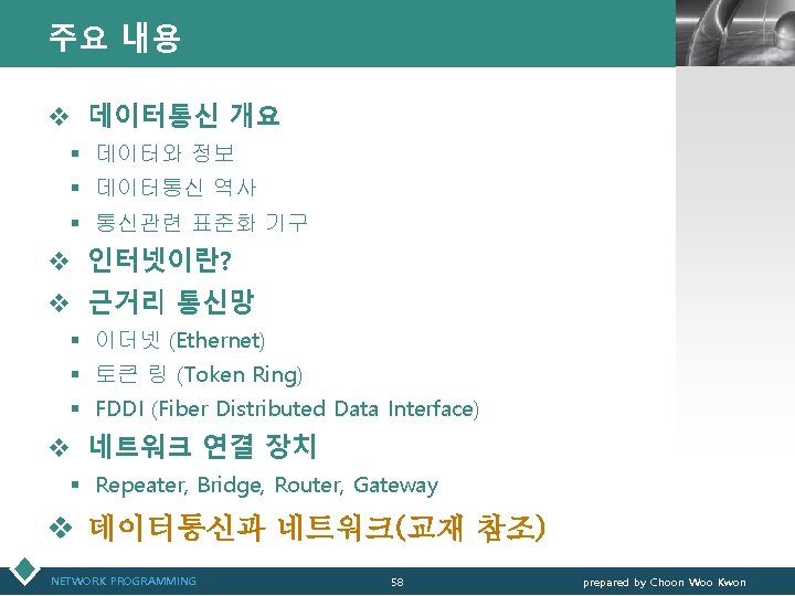 FDDI (Fiber Distributed Data Interface)(계속) v 토큰 링 구현 NETWORK PROGRAMMING LOGO ( Dual Counter – Rotation Rings ) 57 prepared by Choon Woo Kwon