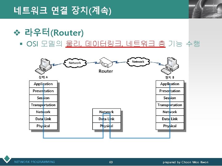 네트워크 연결 장치(계속) LOGO v 연결장치와 OSI 모델 Application Presentation Gateway Application Presentation Session Transport Network Router Network Data link Bridge Data link Physical Repeater Physical NETWORK PROGRAMMING 63 prepared by Choon Woo Kwon