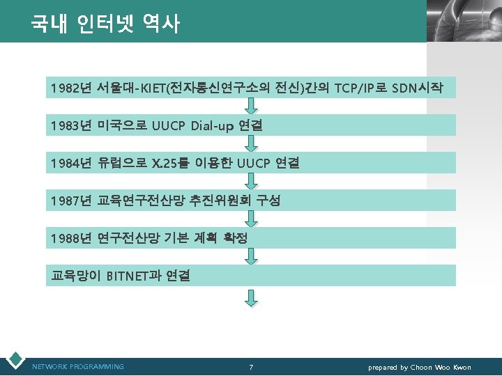 데이터통신 역사 • 1968 LOGO • 1974 • 1975 미국 국방성 고등 연구 계획국 ARPA(Advanced Research Project Agency) Network computer와 terminal 간 digital 회선 연결 패킷 교환 방식 채택 (Packet Switching) Hawaii 대학 ALOHA (Additive Links On-line Hawaii Area) 무선 패킷 교환 통신망 IBM SNA(System Network Architecture) 미국 TELENET, TYMNET (국내) • 1973 • 1984 외환은행 on-line service 데이콤 DACOM-NET • 1968 NETWORK PROGRAMMING 6 prepared by Choon Woo Kwon