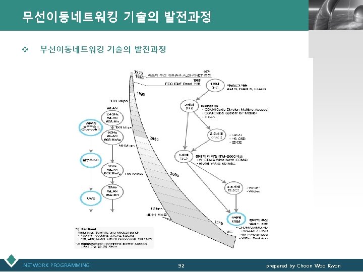 FDDI (Fiber Distributed Data Interface) LOGO v FDDI(Fiber Distributed Data Interface) § 광섬유 사용 • 전기신호를 빛의 펄스로 부호화 • 이더넷 보다 높은 대역폭 제공 § 전송률 : 100 Mbps 지원 § 전송 방법 : 토큰 전송 방식 - token ring 기술 v 프레임 형식 NETWORK PROGRAMMING 55 prepared by Choon Woo Kwon