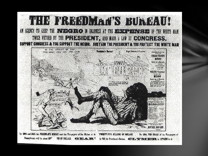 Freedman’s Bureau Created in March 1865 Primitive “welfare agency” supported by Radical Republicans Provided food, clothing and medical care to freed slaves and white refugees Helped reunite families and provided legal representation to African Americans. Establishment of black colleges including Morehouse in Atlanta