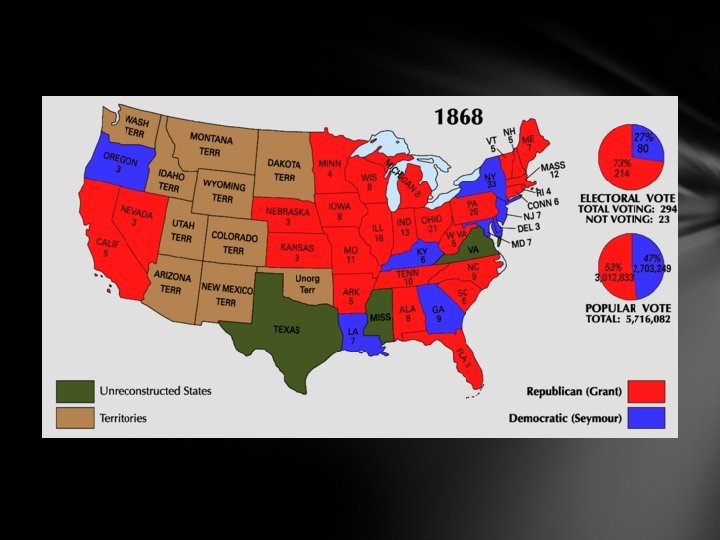 Ulysses S. Grant 1868 – Former commander of the Union troops, U. S. Grant is elected President Highly popular President who enforced Reconstruction policies Administration was tarnished by numerous corruption scandals