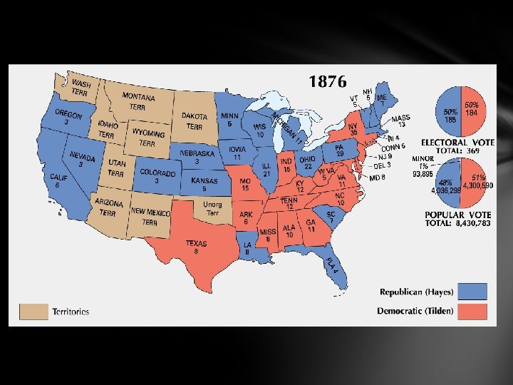 Election of 1876 Democrat Samuel Tilden (top right) won the popular vote over Republican Rutherford B. Hayes (bottom right). Republicans claimed voter fraud in 3 Southern states that Tilden won. When the votes were recounted in these states, Hayes end up the “winner” in all 3.