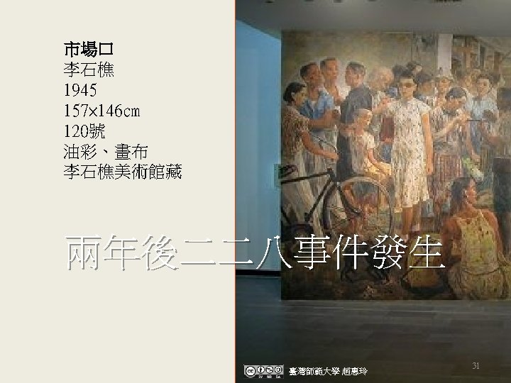版權聲明 作品 授權條件 作者/來源 國立台南生活美學館 / 攝影:黃震南 http: //old. tncsec. gov. tw/b_native_stage/b 01_content. php? area=cy&c 05=&c 03=13&num=&a=0101,根據中華民國著作權法第 50條合 理使用 國立台灣美術館 http: //www 1. ntmofa. gov. tw/opentaiwanart/c/c-2 b 18 -1. htm 根據中華民國著作權法第 50條及國立台灣美術館著作權聲明 台北市立美術館 http: //www. tfam. museum/Collection. Detail. aspx? cid=42 根據中華民國著作權法第 50條及台北市立美術館著作權聲明 台北市立美術館 http: //www. tfam. museum/Collection. Detail. aspx? cid=897 根據中華民國著作權法第 50條及台北市立美術館著作權聲明 高雄市立美術館 / 行政院文化建設委員會國家文化資料庫 http: //elearning. kmfa. gov. tw/liu/p 4. htm,根據中華民國著作權法 第 50條及高雄市立美術館著作權聲明 Wikimedia left: Anonymous right: 今井紹介所 / 來源: left: Mainichi Shimpō (毎日新報) 27 October 1944 right: Keijō Nippō (京城日報) 26 July 1944 http: //commons. wikimedia. org/wiki/File: COMFORTA%EF%BD%8 4%EF%BD%84. GIF 40 2013/12/25 visited