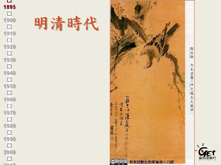 版權聲明 作品 授權條件 作者/來源 楊孟蓉 Wikimedia Heinz Lohmann http: //commons. wikimedia. org/wiki/File: TAIWAN_Karte_Gross. jpg 2013/12/25 visited 教育部數位教學資源入口網 謝琯樵「古木蒼鷹」, http: //content. edu. tw/local/tainan/kunhwa/eight 1. htm ,根據中華民 國著作權法第 50條及教育部數位教學入口網著作權聲明 教育部數位教學資源入口網 曾茂西「秋塘野鳧」, http: //content. edu. tw/local/tainan/kunhwa/eight 1. htm ,根據中華民 國著作權法第 50條及教育部數位教學入口網著作權聲明 Wikimedia石川欽一郎 / 攝影: 彭瑞麟 / 來源: 台北亞圃廬寫真場 http: //commons. wikimedia. org/wiki/File: Ishikawa_Kinichiro. jpg 2013/12/25 visited Wikimedia 石川欽一郎 / 來源: 台灣美術圖像與文化解釋 http: //commons. wikimedia. org/wiki/File: Isikawa 4. jpg 2013/12/25 visited 38