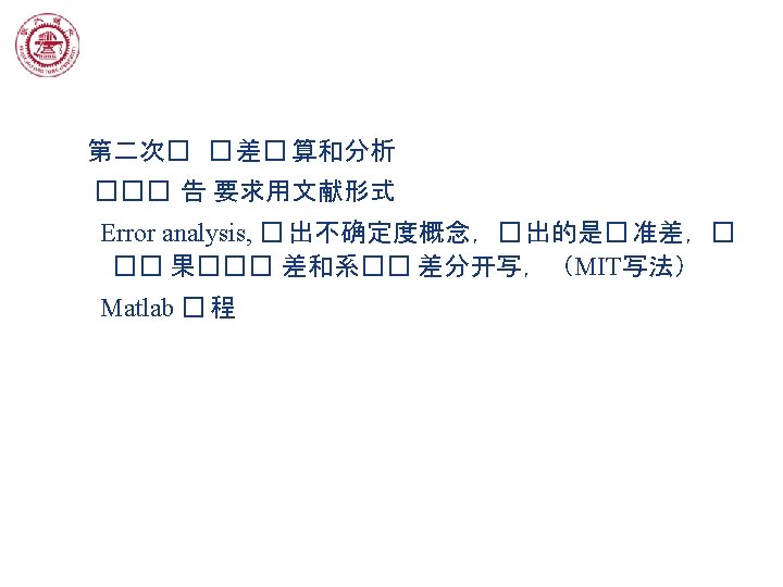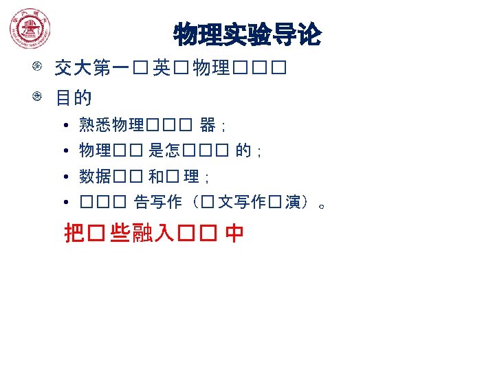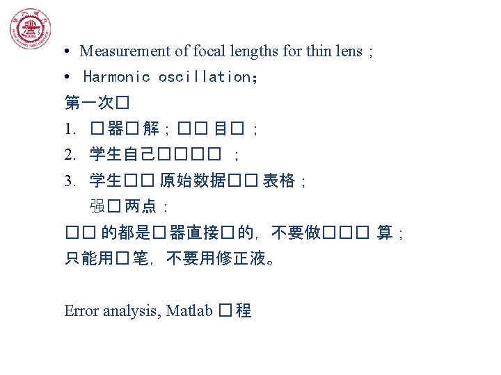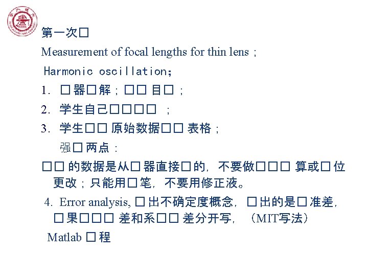 1896 1920 第一学年第一学期 Introduction to Experimental Physics total: 6*6=36 hours GPA: 2 Experiment list 1. Harmonic oscillation, introduction to Origin 2. Measurement of focal lengths for thin lens, Error analysis 3. Measurement of speed of sound, oscilloscope 4. Measurement of speed of sound, oscilloscope 5. Temperature sensors 6. Independent designed lab 1987 2006
