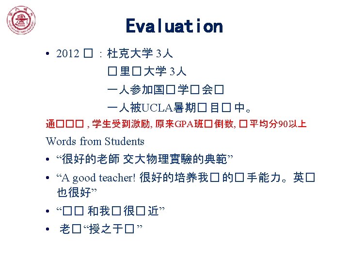 Course Features China Undergraduate Physicists’ Tournament • Two top grade award in Shanghai competition area 2013 • Second class prize in national 2013
