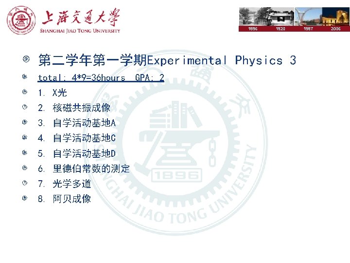 1896 1920 1987 第二学年第一学期Experimental Physics 2 total: 6*8=48 hours GPA: 3 Experiment list 1. Properties of the Optical Grating 2. Practice and Application of Michelson Interferometer 3. Application of balanced and non-balanced Wheatstone Bridges 4. RLC Circuits 5. Properties of Silicon Photocell and Solar Cell 6. Investigation of the properties of Magnetic Material 2006