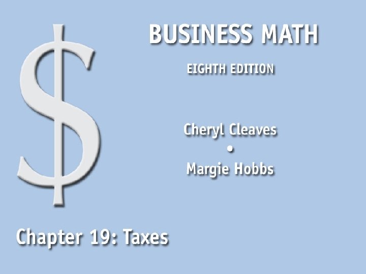 Try these examples n Find the marked price and sales tax on a box of popcorn which has a total price of $3. 50. The local tax rate is 6%. n n Marked price is $3. 30; tax is $0. 20. Find the marked price and sales tax on a soft drink which has a total price of $2. 50. The local tax rate is 6. 5%. n Business Math, Eighth Edition Cleaves/Hobbs Marked price is $2. 35; tax is $0. 15. © 2009 Pearson Education, Inc. Upper Saddle River, NJ 07458 All Rights Reserved
