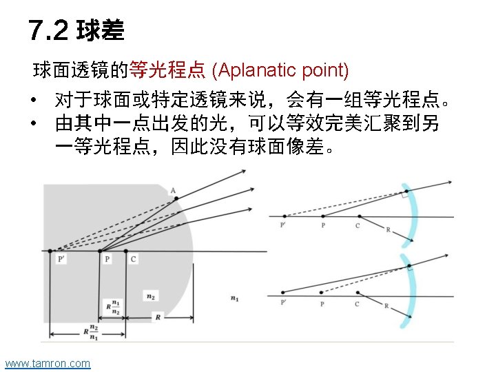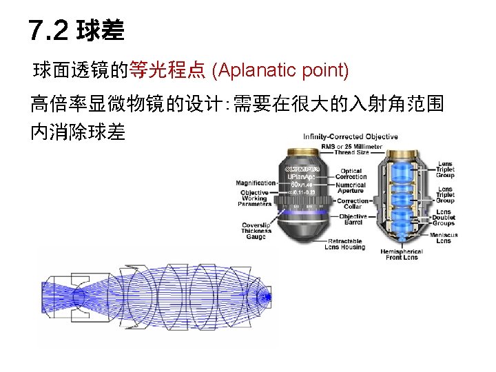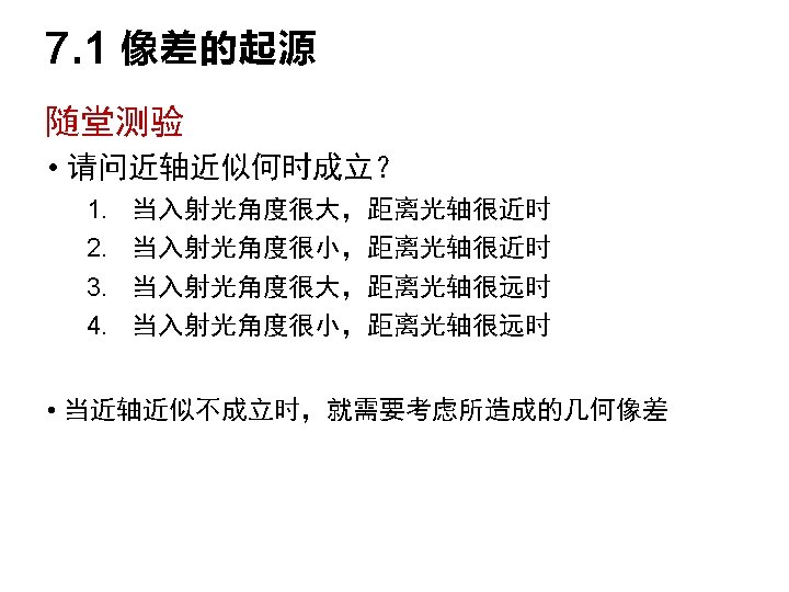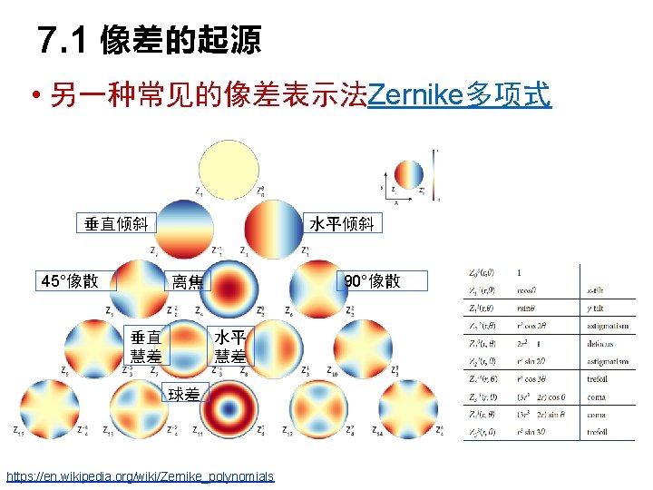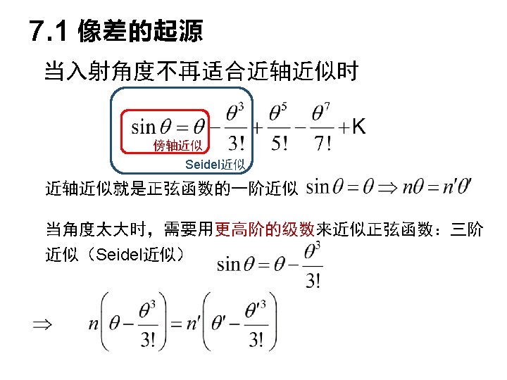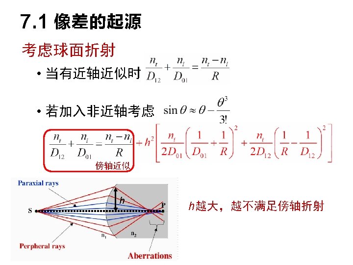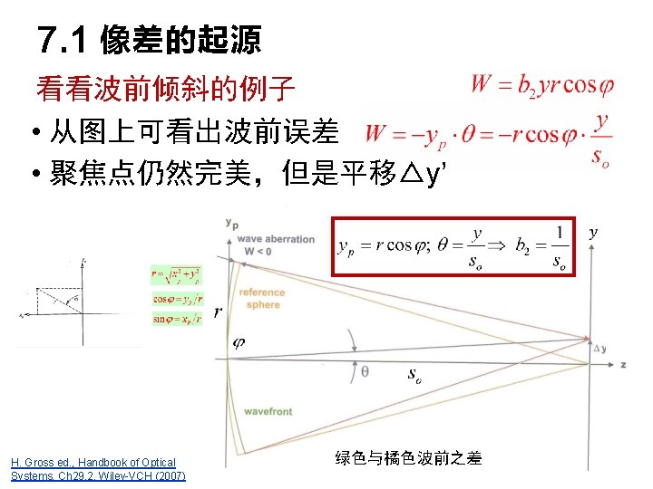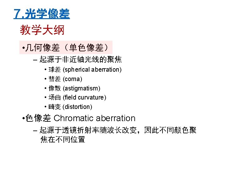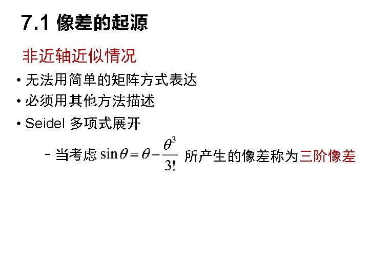7. 1 像差的起源 其他五种像差 球差 慧差 像散 场曲 • 统称为几何像差 • 在后面一一描述 畸变 H. Gross ed. , Handbook of Optical Systems, Ch 11. 5, Wiley-VCH (2007) H. Gross ed. , Handbook of Optical Systems, Ch 29. 4, Wiley-VCH (2007)