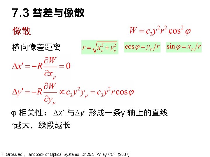 7. 3 彗差与像散 如何消除像散 • 改变透镜的形状 子午面焦点重合 H. Gross ed. , Handbook of Optical Systems, Ch 31, Wiley-VCH (2007)