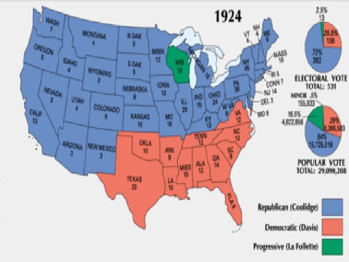 Teapot Dome Scandal • Oil-rich public land set aside by gov’t in Teapot Dome, Wyoming and Elks Hills, CA under US Navy • Fall got reserves transferred to interior dept. • Secretly leased land to 2 private oil Co. ’s; Fall became wealthy • Harding died on Aug. 2, 1923, Coolidge becomes President and is reelected in 1924