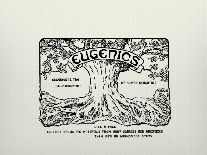 • American Eugenics Society • American Breeders Association • Human Betterment Foundation • Eugenics Records Office at Cold Harbor Spring Laboratories • The Galton Society (Madison Grant & Charles Davenport) • Various local eugenics societies, ran eugenics programs for schools and communities, ran contests • Planned Parenthood • Immigration Restriction League Teddy Roosevelt, Woodrow Wilson, Calvin Coolidge, WEB Du Bois, Charlotte Perkins Gilman, Jack London, Margaret Sanger