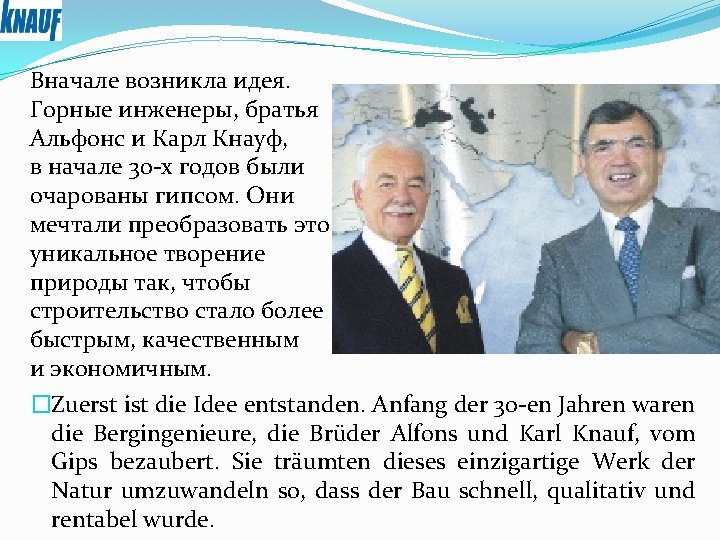 1932 год �В 1932 году братья Кнауф основали фирму «Райнише Гипсиндустри унд Бергверксунтернемен» и открыли первый завод по производству сухих строительных смесей на основе гипса в Перле на реке Мозель. In 1932 haben die Brüder Knauf die Firma "Reinische Gipsindustrie und Bergwerksunternehmen» gegründet und haben den ersten Betrieb nach der Produktion der trockenen Baumischungen aufgrund des Gipses in der Perle auf dem Fluss Mosel geöffnet.