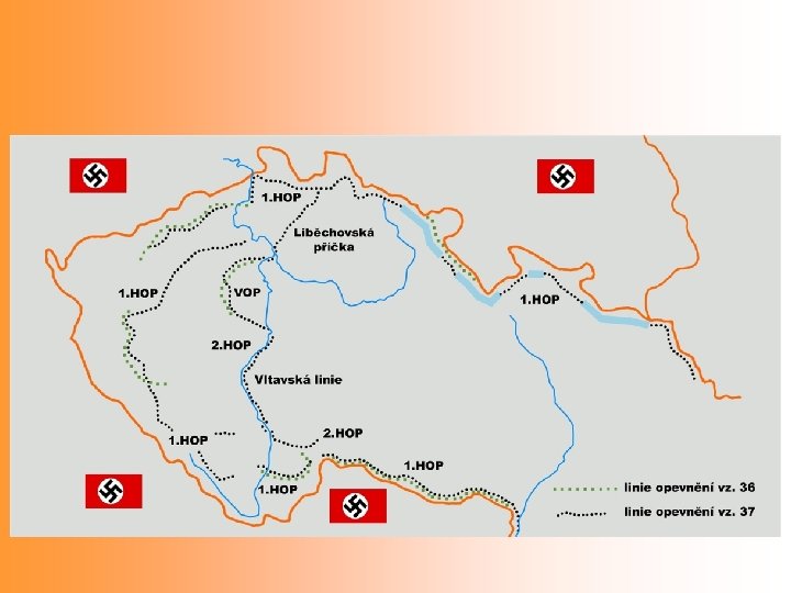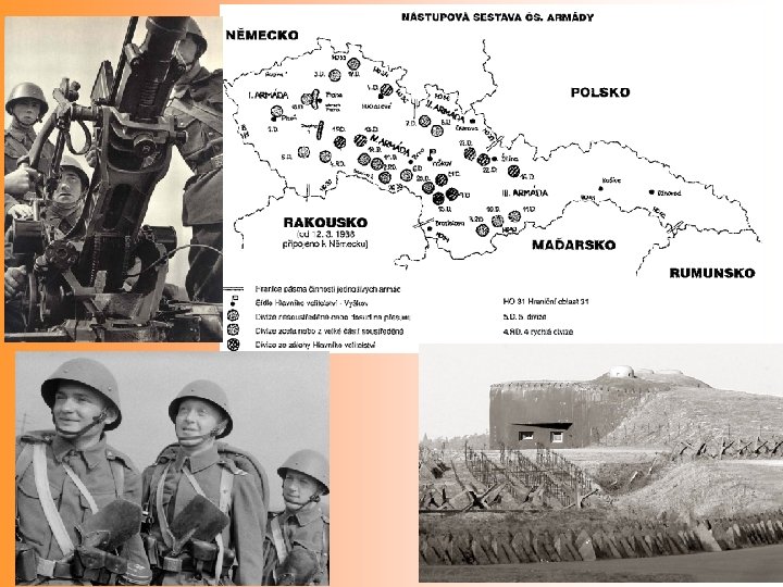 Jak byla republika připravena k obraně? • 1, 5 milionu vojáků • moderní, ale nedokončená opevnění (dokončeno • 9 982 malých a 267 velkých pevností, ale chyběly palebné kopule, radiotelegrafická a protiletecká výzbroj ), nechráněná hranice s Rakouskem • 1 600 letadel, zastaralé typy • Stavba opevnění, modernizace výzbroje, vytvoření rezerv střeliva a pohonných hmot by byly zakončeny v polovině 40. let • Spojenec Francie- příliš vzdálená, strategicky nefunkční spojenectví • Poměr německé a čs. armády 4: 1