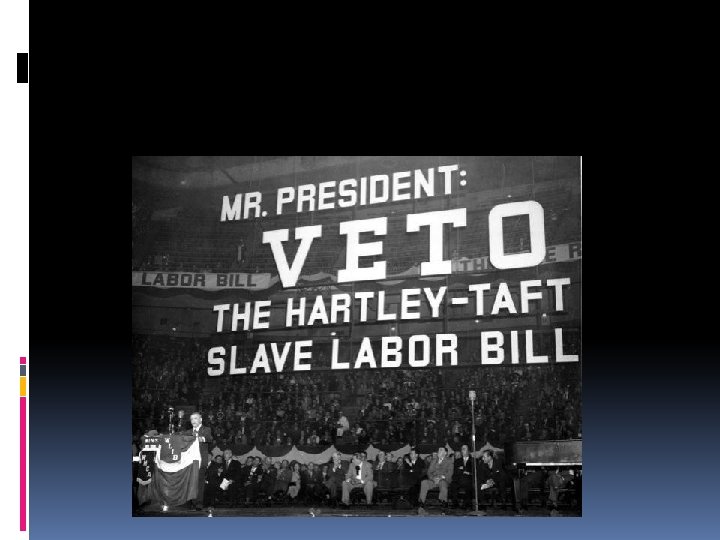 Post-War economic anxieties Prices rose 33% as price controls disappeared 4. 6 million workers strike in 1946 Congress passes Taft-Hartley Act over Truman’s vetoed -“slave-labor” act Outlawed closed shop-union only Union leaders had to take a non-communist oath Unions had to give 80 days notice before strikes