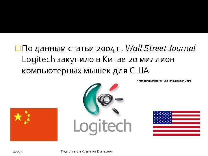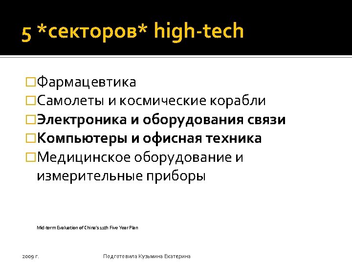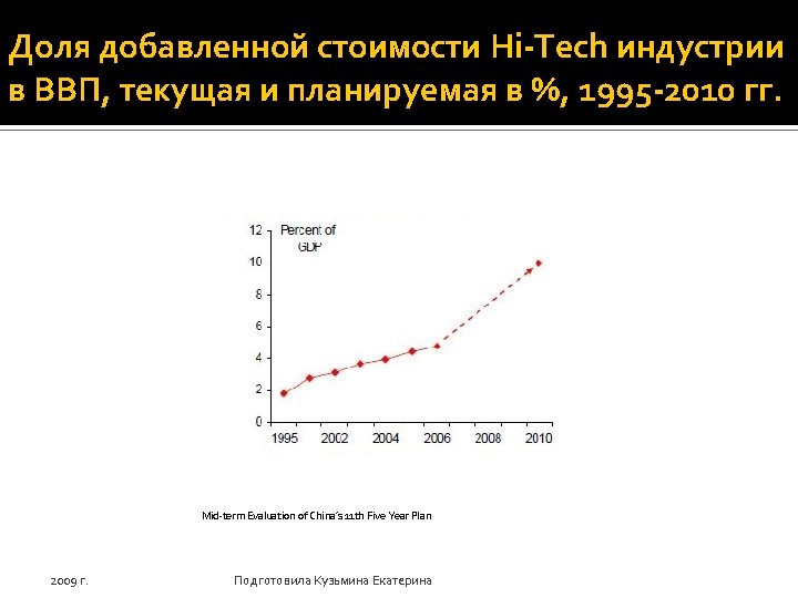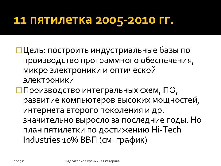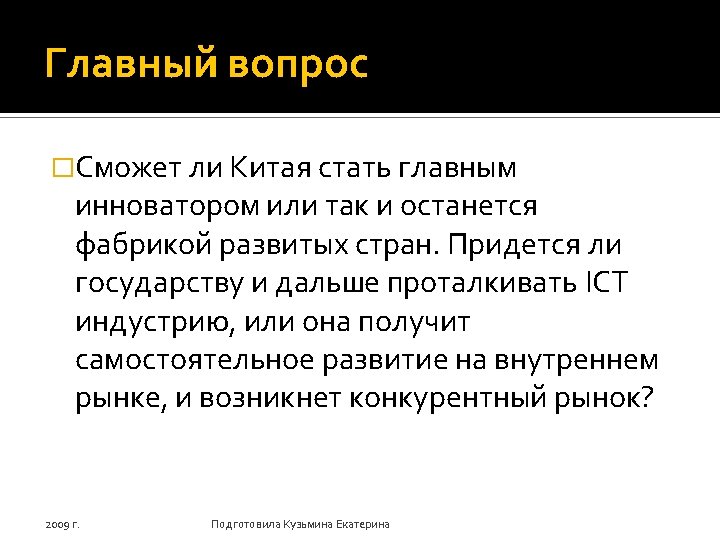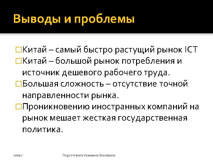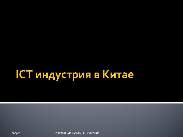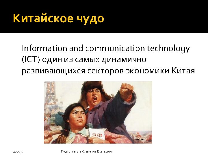 Статьи � China's ICT Industry: Current State and Future Direction (Gartner) � Made in China Information Technologies and the Internet(Weforum) � Mid-term Evaluation of China’s 11 th Five Year Plan (World bank) � Promoting Enterprise-Led Innovation in China (World bank) � Science and technology in the People's Republic of China (Wikipedia) � Status and Overview of Official ICT Indicators For China (OECD) � Status and Overview of Official ICT Indicators of China (Scribid) 2009 г. Подготовила Кузьмина Екатерина
