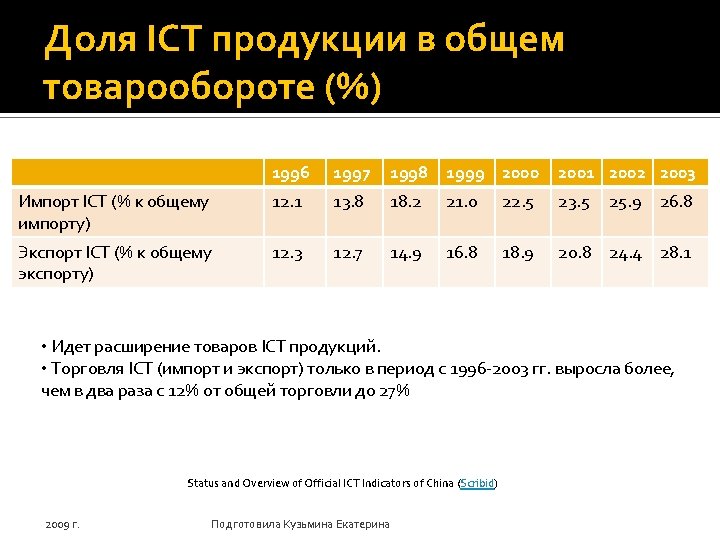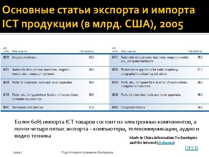Импорт и экспорт ICT Made in China Information Technologies and the Internet(Weforum) 2009 г. Подготовила Кузьмина Екатерина