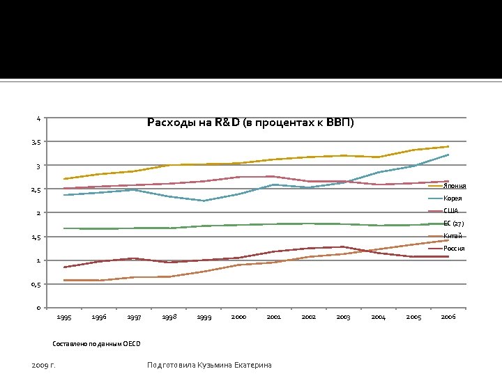 400000 Экспорт ICT продукции ($, млн) 350000 300000 250000 Япония Корея 200000 США Китай 150000 100000 50000 0 1996 1997 1998 1999 2000 2001 2002 Составлено по данным OECD 2009 г. Подготовила Кузьмина Екатерина 2003 2004 2005 2006 2007