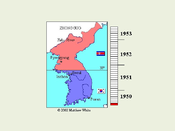 Začetek vojne q. V noči med 24. in 25. junijem 1950, q. Severno Korejske enote prečkajo 38. vzporednik, qnapadejo glavno mesto Južne Koreje – Seul. q. Severno Korejo podpreta SZ in Kitajska, q. Južno Korejo podpre ZDA.
