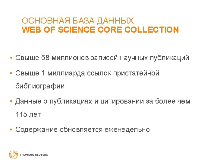 Платформа Web of Science MEDLINE Data Citation Index Inspec CABI Web of Science BIOSIS Citation Index Chinese Citation Index (c 2009 г. ) Core Collection Sci. ELO Citation Index (с 2013 г. ) Zoological Record Russian Citation Index (c 2015/16 г. ) Korean Citation Index (c 2014 г. )