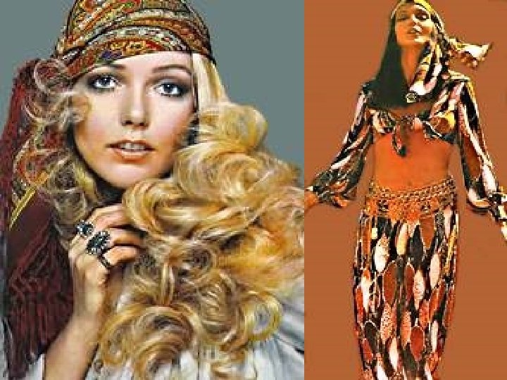Hippie Fashion • Long hair, beads, bell bottom jeans, bare feet or sandals, head bands, loose-fitting or ethnic clothing.