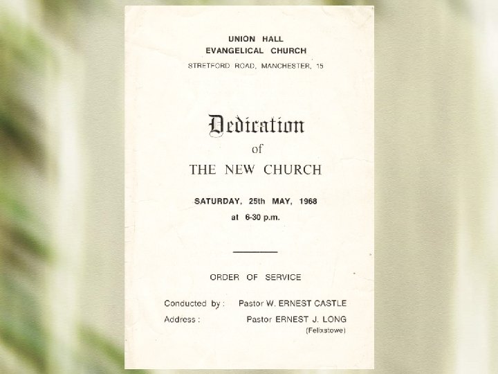 40 years of witness • 1962 - Compulsory Purchase Order on the 2 mission halls in Vine Street • 1962 - Objections raised • 1963 - Objections withdrawn • 1963 - 1966 Discussions with Local Authority for a new site and plans drawn up • 1966 - Compensation agreed! • Foundation Stone laid 24 th June 1967 • Dedication of the new church 25 th May 1968 • 2 nd regeneration of Hulme commenced 1990 s • We are still here!