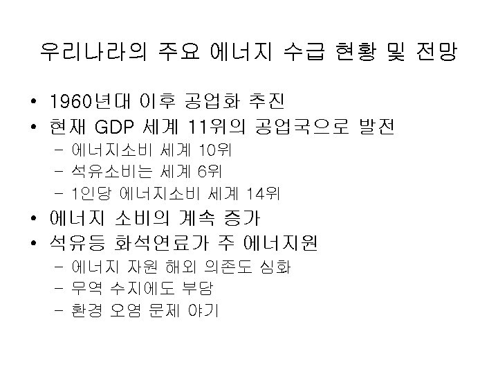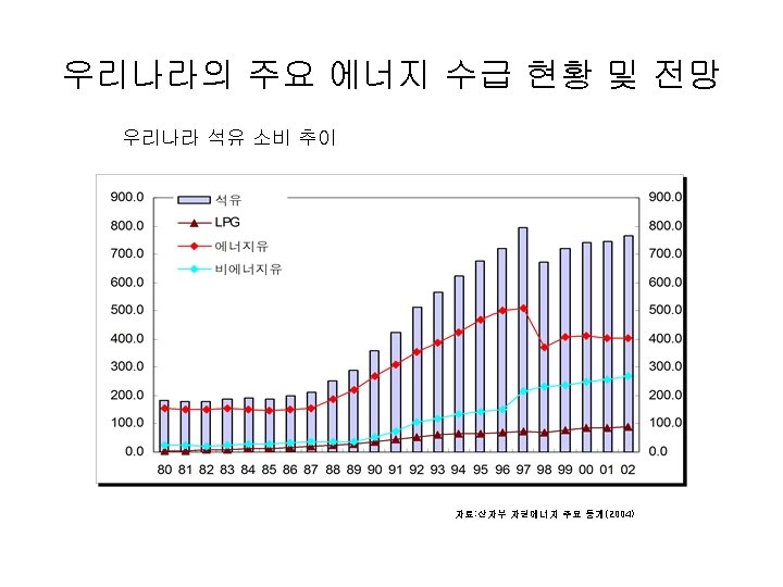 우리나라의 주요 에너지 수급 현황 및 전망 • 구분 우리나라 에너지 수급 현황 총괄 1970 1980 1996 1997 1998 1999 2000 2002 2003 2004 19, 678 (11. 9) 43, 911 (1. 6) 93, 192 (14. 1) 165, 212 (9. 8) 180, 638 (9. 3) 165, 932 (-8. 1) 181, 363 (9. 3) 192, 887 (6. 4) 208, 636 (5. 2) 215, 067 (3. 1) 220, 238 (2. 4) 229, 333 (4. 1) GDP성장율, % - -1. 5 9. 2 7. 5 4. 7 -6. 9 9. 5 8. 5 7. 0 3. 1 4. 7 4. 0 에너지/GDP탄성치 - -1. 07 1. 53 1. 4 1. 98 1. 17 0. 98 0. 75 0. 74 1. 00 0. 51 1. 03 1인당에너지소비, TOE(%) 0. 61 (8. 9) 1. 15 (0. 0) 2. 17 (13. 0) 3. 63 (8. 7) 3. 93 (8. 3) 3. 58 (-8. 9) 3. 89 (8. 7) 4. 10 (5. 4) 4. 38 (4. 5) 4. 49 (2. 5) 4. 58 (2. 0) 4. 75 (3. 7) 1인당전력소비량, Kwh(%) - 859. 0 (3. 5) 2, 202 4, 006 (9. 0) 4, 366 (9. 0) 4, 167 (-4. 6) 4, 572 (9. 7) 5, 067 (10. 8) 5, 845 (7. 4) 6, 126 (4. 8) 6, 491 (6. 0) 6, 880 (6. 0) 석유의존도, % 47. 2 61. 1 53. 8 60. 5 60. 4 54. 6 53. 6 52. 0 49. 1 47. 6 45. 7 44. 3 에너지해외의존도, % 47. 5 73. 5 87. 9 97. 3 97. 6 97. 1 97. 2 97. 1 96. 9 96. 7 96. 4 에너지수입증가율, % - 76. 6 45. 1 29. 9 11. 9 -33. 1 25. 4 65. 2 -4. 2 18. 6 29. 5 34. 5 총수입에너지비중, % - 29. 5 15. 6 16. 1 18. 7 19. 4 18. 9 23. 4 21. 2 21. 4 22. 1 25. 5 에너지소비, 천TOE(%) 자료: 산자부 통계 자료 2005