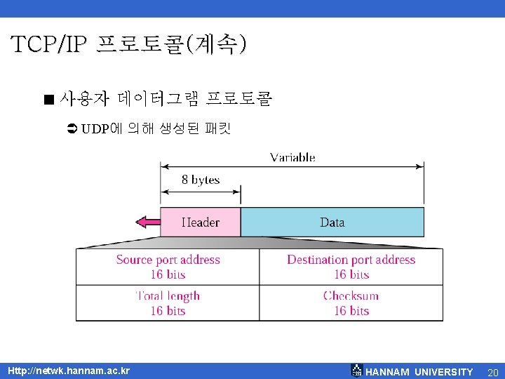 TCP/IP 프로토콜(계속) < 전송 계층 Ü TCP(Transmission Control Protocol) Ü UDP(User Datagram Protocol) Ü 포트(Port)를 이용한 송수신 Ü 16비트 포트주소 사용(0~65, 535) Http: //netwk. hannam. ac. kr HANNAM UNIVERSITY 19
