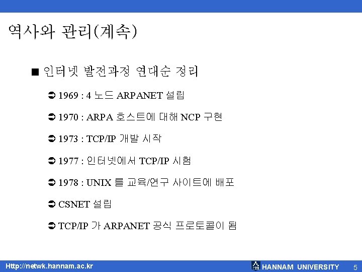 역사와 관리(계속) < 현재의 인터넷 Http: //netwk. hannam. ac. kr HANNAM UNIVERSITY 4