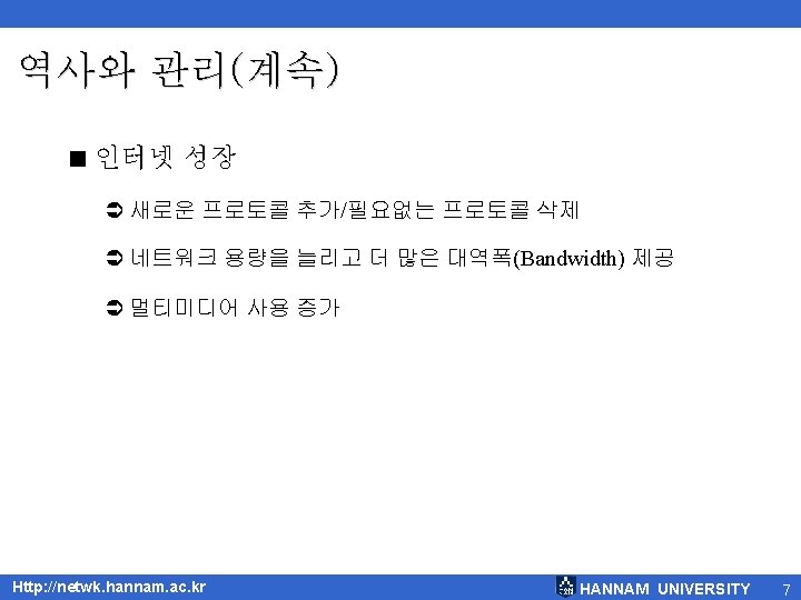 역사와 관리(계속) Ü 1983 : MILNET 탄생 Ü 1986 : NSFNET 설립 Ü 1990 : ARPANET 해체, NSFNET 로 대체 Ü 1995 : NSFNET 이 연구 네트워크 Ü 1995 : ISP(Internet service provider)라는 회사가 생김 Http: //netwk. hannam. ac. kr HANNAM UNIVERSITY 6