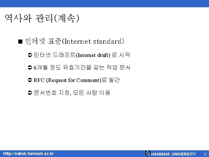 역사와 관리(계속) < RFC 완성 과정 Ü 제안 표준(Proposed Standard) Ü 드래프트 표준(Draft Standard) Ü 인터넷 표준(Internet Standard) Ü 기록 단계(Historic) Ü 실험 단계(Experimintal) Ü 정보 제공(Informational) Http: //netwk. hannam. ac. kr HANNAM UNIVERSITY 9