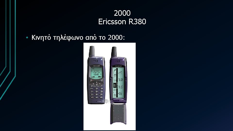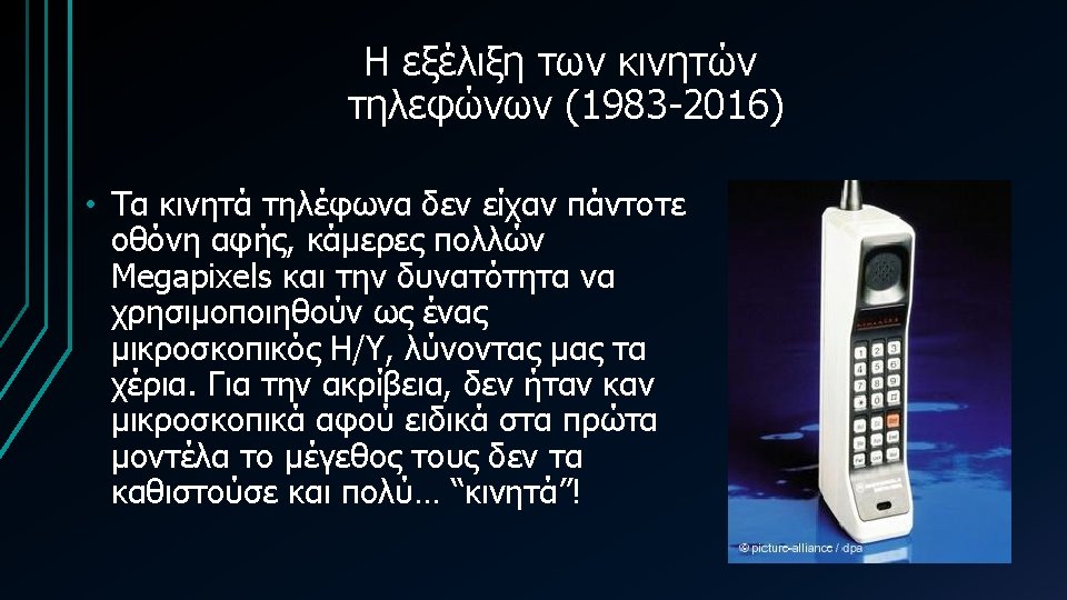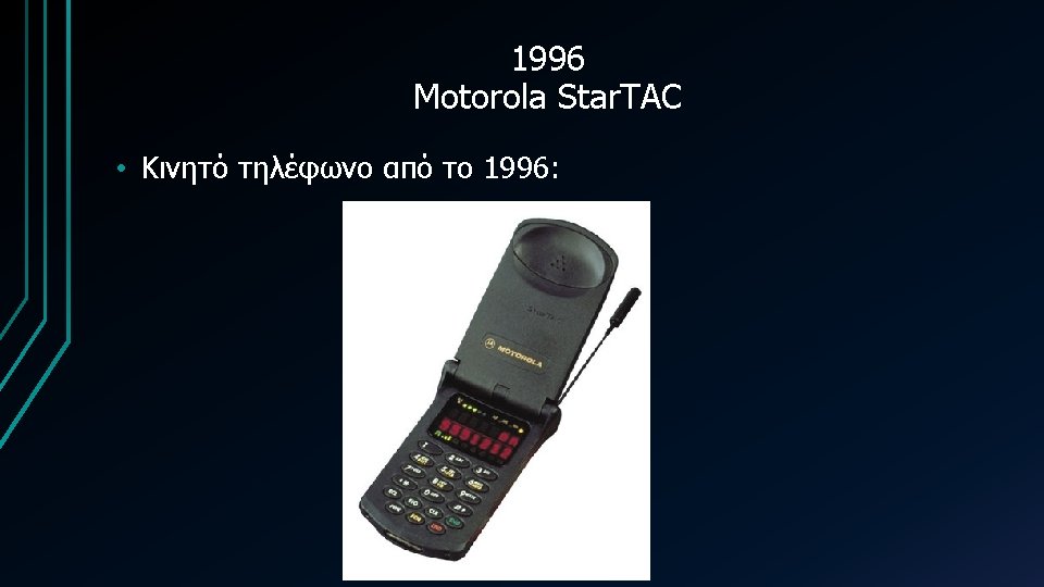 1983 Motorola Dyna TAC 8000 X 1983 1989 Slides: 29 Download presentation 1983 Motorola Dyna. TAC 8000 X • Κινητό τηλέφωνο από το 1983: 1989 Motorola Micro. TAC 9800 X • Κινητό τηλέφωνο από το 1989: 1992 Motorola International 3200 • Κινητό τηλέφωνο από το 1992: 1993 Bell. South/IBM Simon Personal Communicator • Κινητό τηλέφωνο από το 1993: 2012 Samsung Galaxy note • Κινητό τηλέφωνο από το 2012: Πηγές • http: //www. otherside. gr/2009/06/evolution-of-cell-phonedesign-between-1983 -2009/ • http: //www. webdesignerdepot. com/2009/05/the-evolution-ofcell-phone-design-between-1983 -2009/