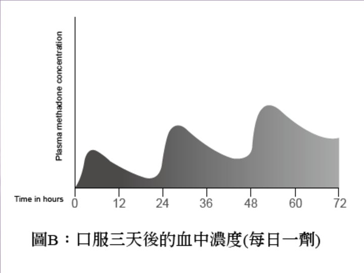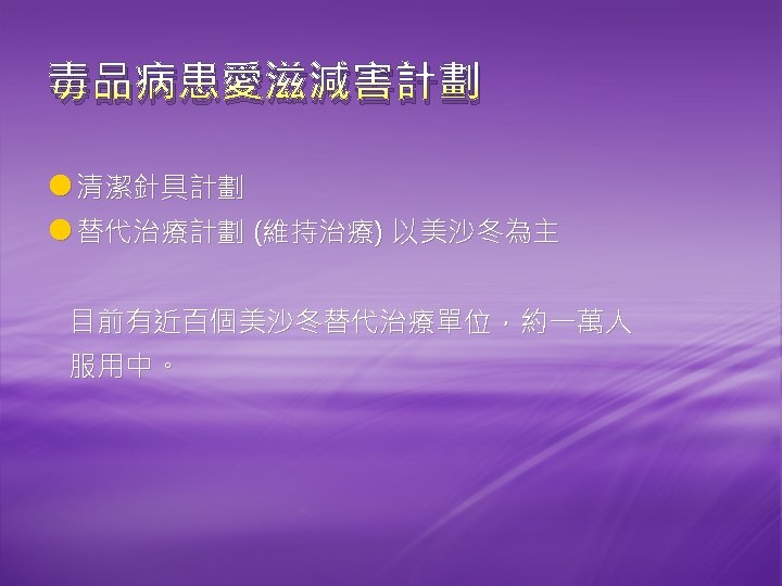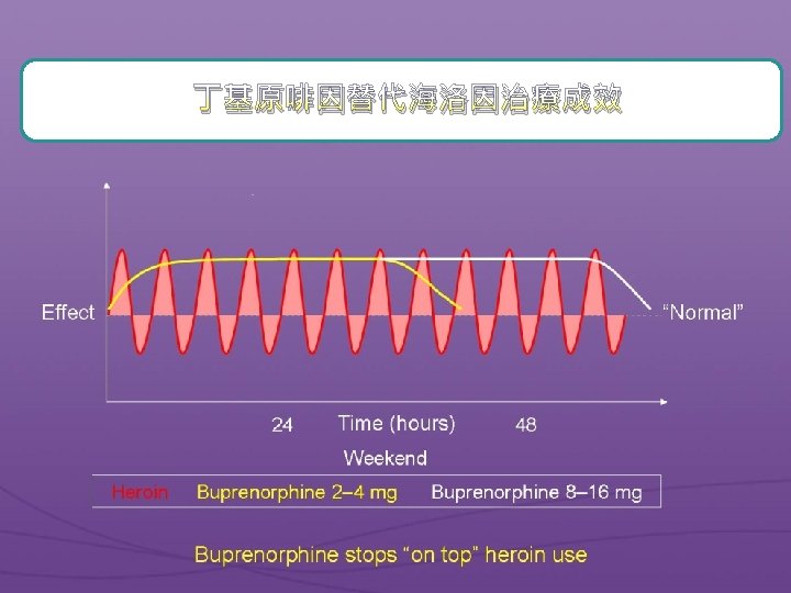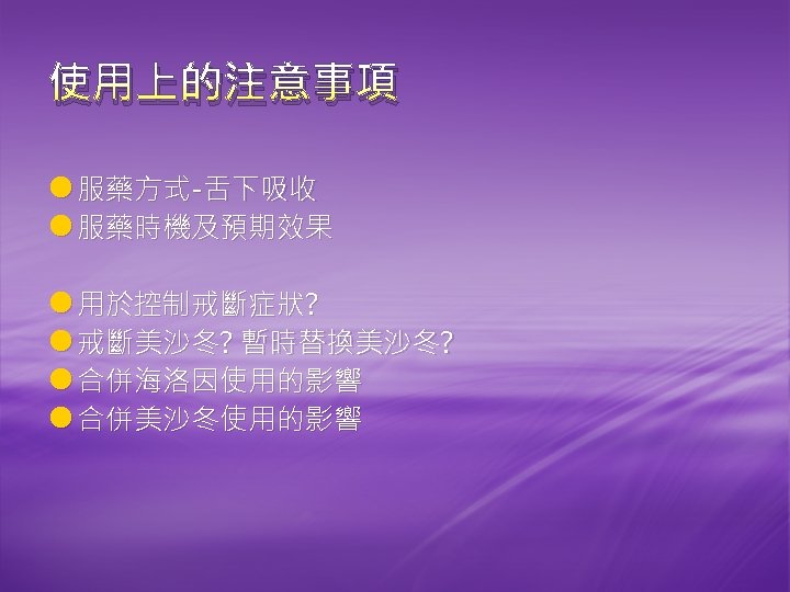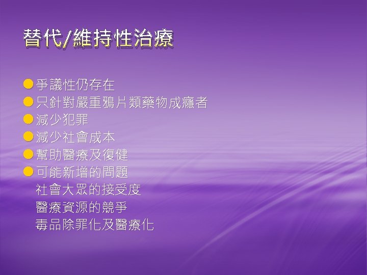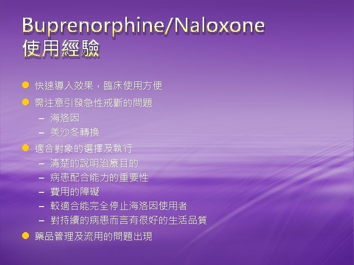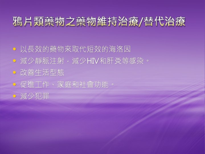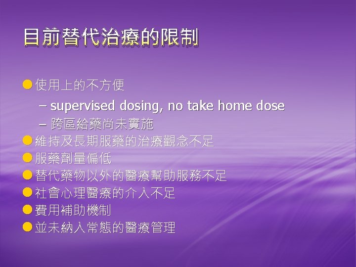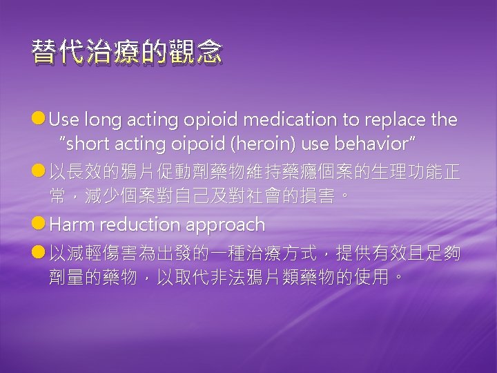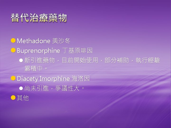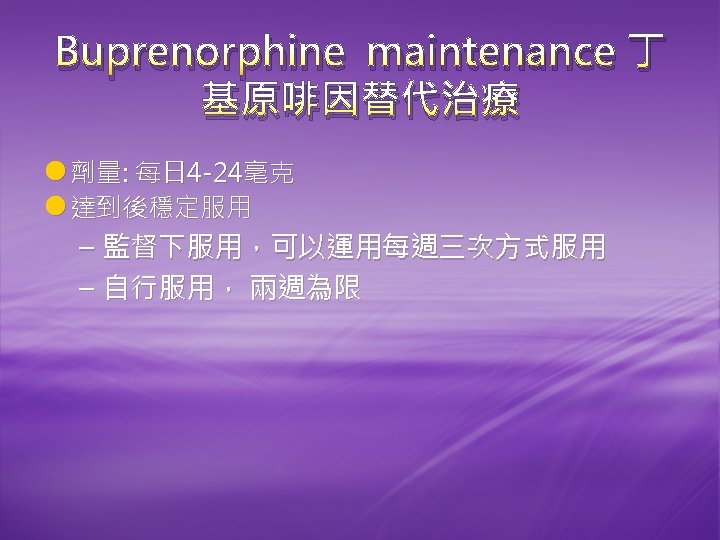 美沙冬替代治療 l 使用劑量dosage 維持劑量 maintenance dose 60 -120 mg/day ? ? plasma level: 150 -200 ng/ml l 使用方式 route 口服 oral 每日監督下給藥 supervised dosing l 使用期間 duration of treatment 維持性,長期使用 ** maintenance use