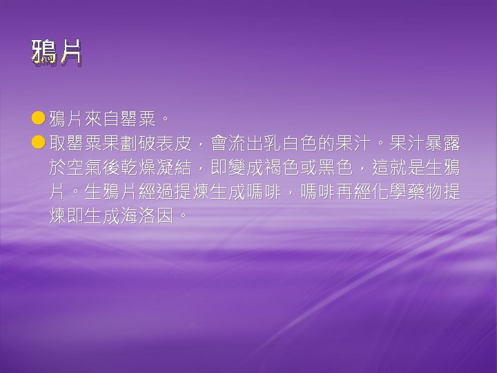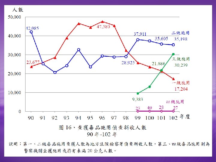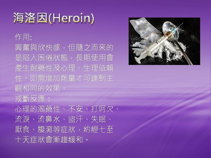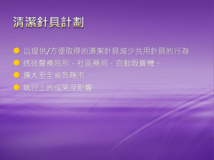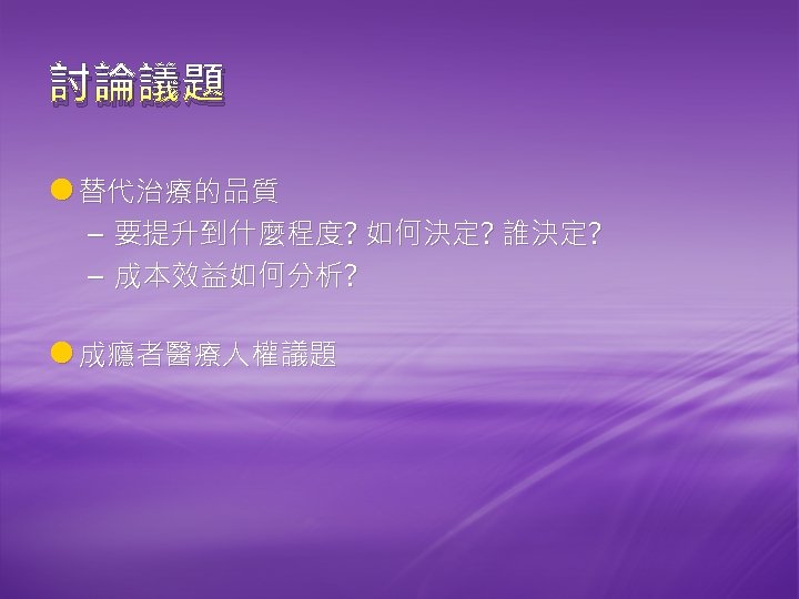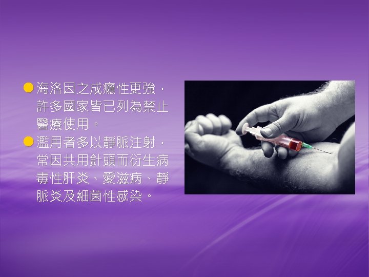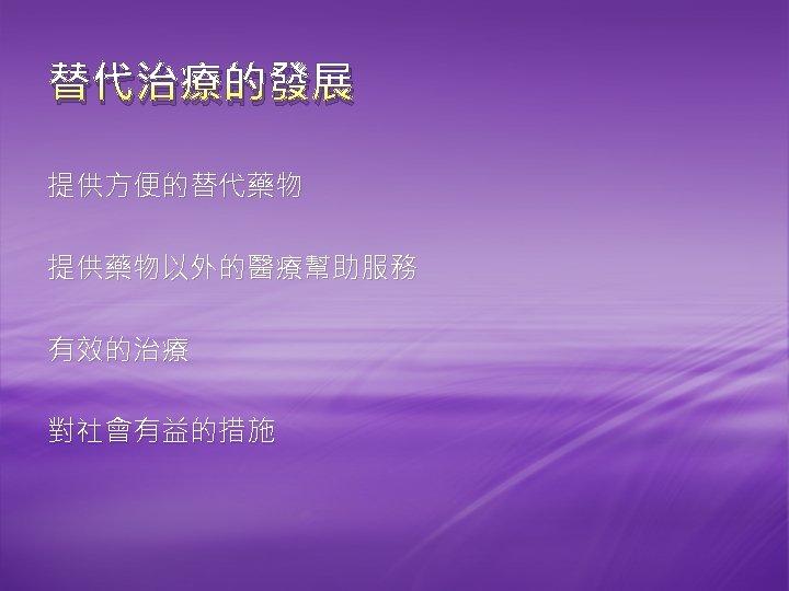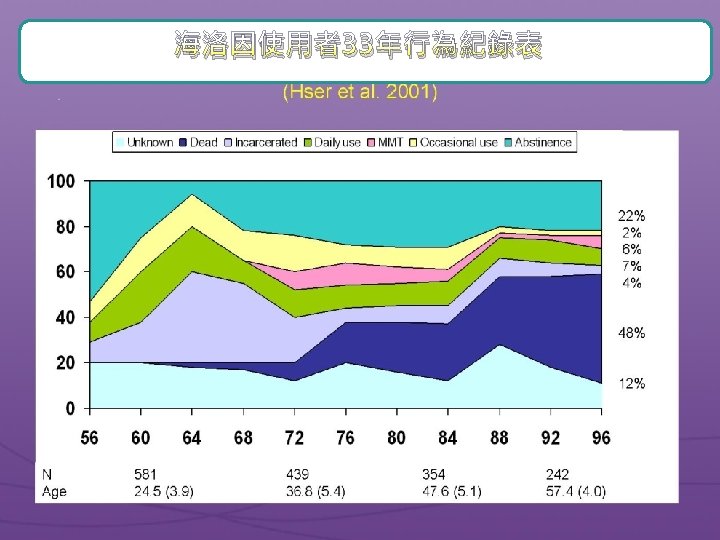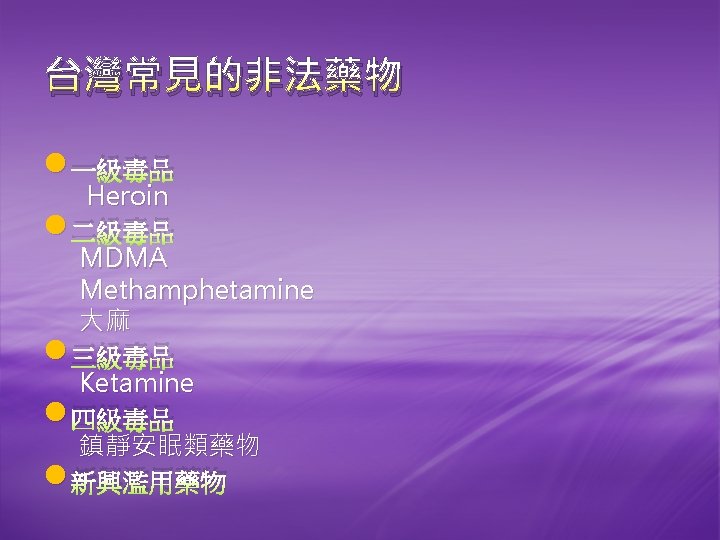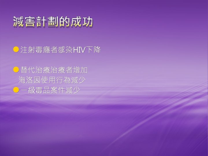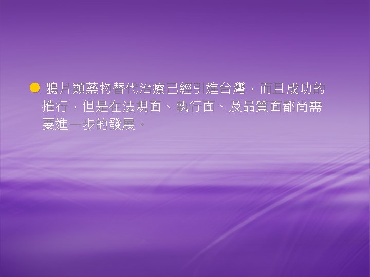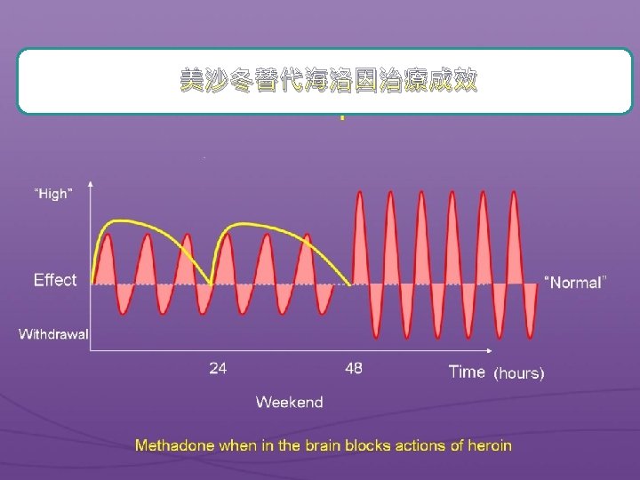美沙冬替代治療 l 使用劑量dosage 維持劑量 maintenance dose 60 -120 mg/day ? ? plasma level: 150 -200 ng/ml l 使用方式 route 口服 oral 每日監督下給藥 supervised dosing l 使用期間 duration of treatment 維持性,長期使用 ** maintenance use