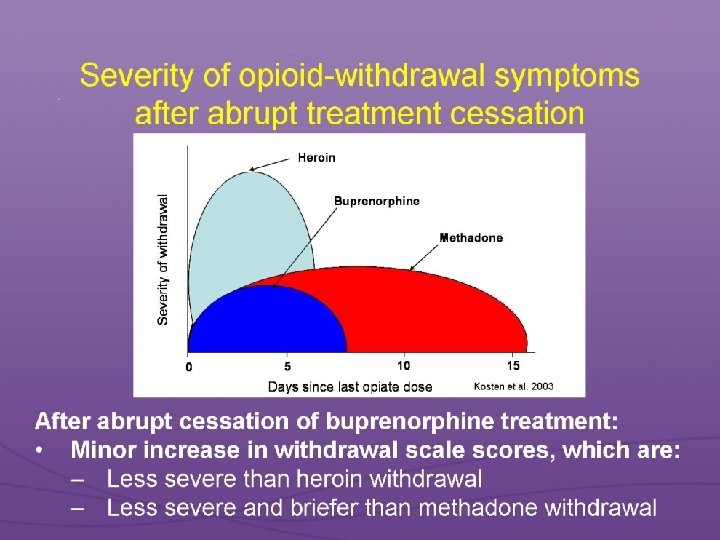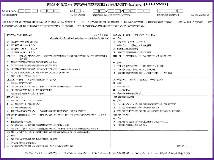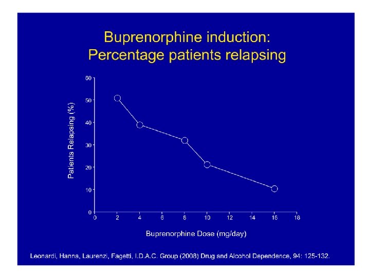 Buprenorphine 替代治療 – 導入 l Induction in 3 days l Wait after the withdrawal symptoms l Dosing schedule – Short acting opioid 2+6, 8 -16, 8 -24 – Long acting opoid 0, 4, 8 -16, 8 -24