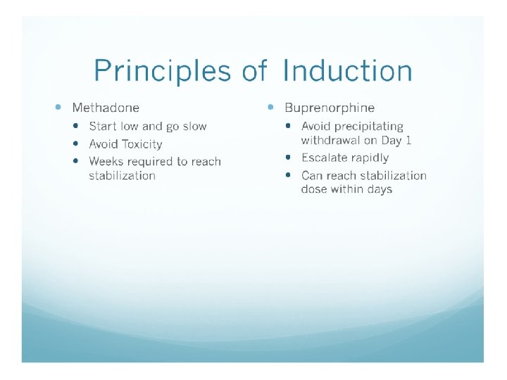 美沙冬導入期 l 完成必要檢驗 l 導入劑量的決定 目並沒有精確計算導入劑量的方式, 需要臨床調整 Initially start low and go slow—patient still use heroin Too aggressive strategy—possible methadone overdose