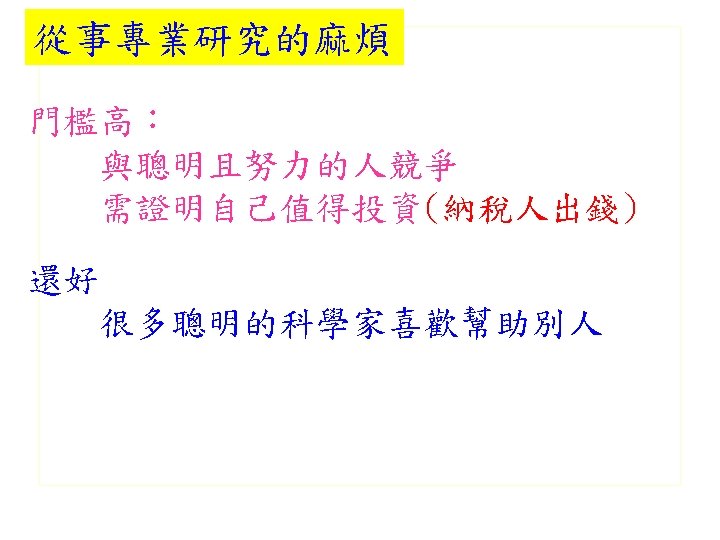 Importance ü Fun & Time ü Love Science & Scientific Thinking ü Focus (Do one thing in a period of time) ü Good Advisers ü Suitable Environment ü Not trapped in what I can’t do well ü Confident ü Smart, but not very smart ü Support from family ü 30