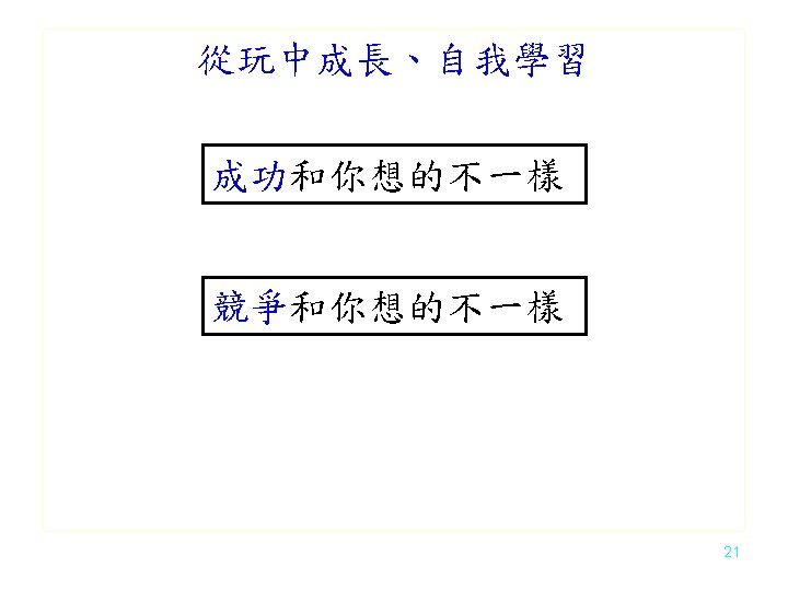 Tricks to survive: Learn fast, steady. 自發學習 Don’t give up too fast. Tricks to live: orts Focused eff ts Broad interes 為了要深入而廣博 Tricks to have fun: Interest, Ability, Communicate 38