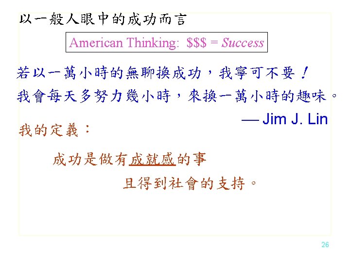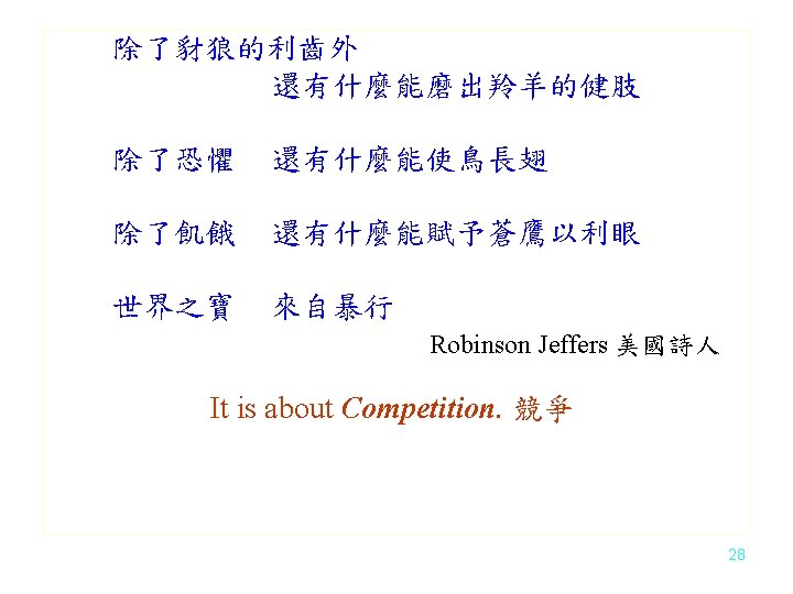 成功和你想的不一樣 It is about Competition. You need some unfair advantages. 競爭和你想的不一樣 27