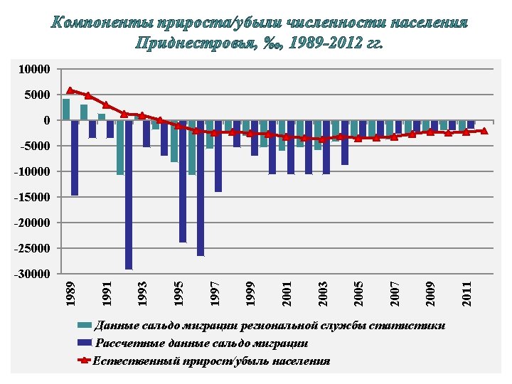 1989 2011 1989 739700 4235 14842 1991 730300 Slides: 13 Download presentation Динамика численности и миграционной убыли населения Приднестровья, 1989 -2011 гг. Годы Официальные Расчетные Официальные данные численности сальдо населения миграции Расчетные данные сальдо миграции 1989 739700 4235 -14842 1991 730300 735830 -1264 -3544 1992 729600 685616 -10764 -29240 1993 702500 679587 1119 -5316 1994 701700 662806 -1858 -7088 1995 691600 645076 -8264 -23924 1996 679100 635096 -10723 -26582 2003 623900 565402 -5961 -10633 2004 554400 -4196 -8861 2005 547500 -3296 -3378 2007 2011 533500 513400 533754 511101 -3830 -2271 -2761 -1710