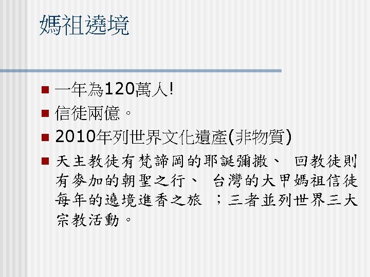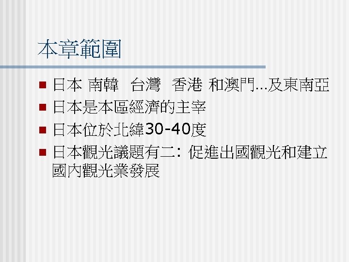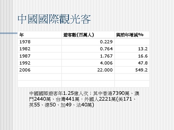 台灣國際觀光客 inbound 年 /千人 1993 2001 2011 地區 Japan 703, 953 977, 705 1294, 758 China - - 1784, 185 USA 269, 110 366, 297 412, 617 Hong Kong 213, 953 392, 552 817, 944 S Korea 96, 088 86, 408 242, 902 Singapore 60, 796 80, 028 299, 599 Malaysia 51, 265 66, 516 307, 898 Europe 121, 965 209, 110 212, 148 Other 333, 084 438, 521 715, 433 1850, 214 2617, 137 6087, 484 TOTAL 中國: 2008年 329, 204 中國: 2009年 972, 123
