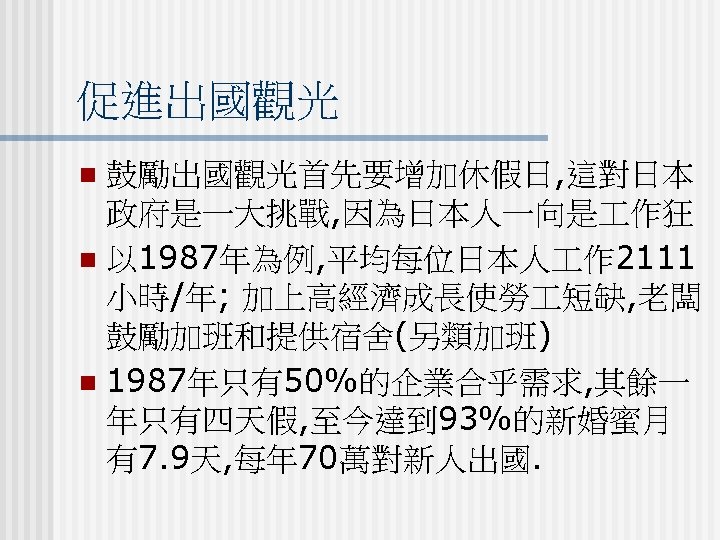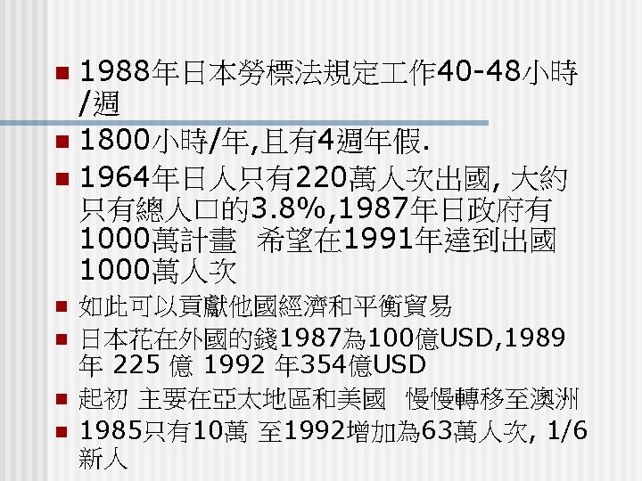 東南亞國協(ASEAN) inbound 年 /千人 1992 地區 ASEAN 1810. 920 Japan 1000. 775 Taiwan 386. 061 Australia 385. 079 UK 303. 310 USA 587. 576 Hong Kong 232. 591 India 195. 469 Germany 160. 376 S Korea 156. 399 Others N/A TOTAL 5989. 940