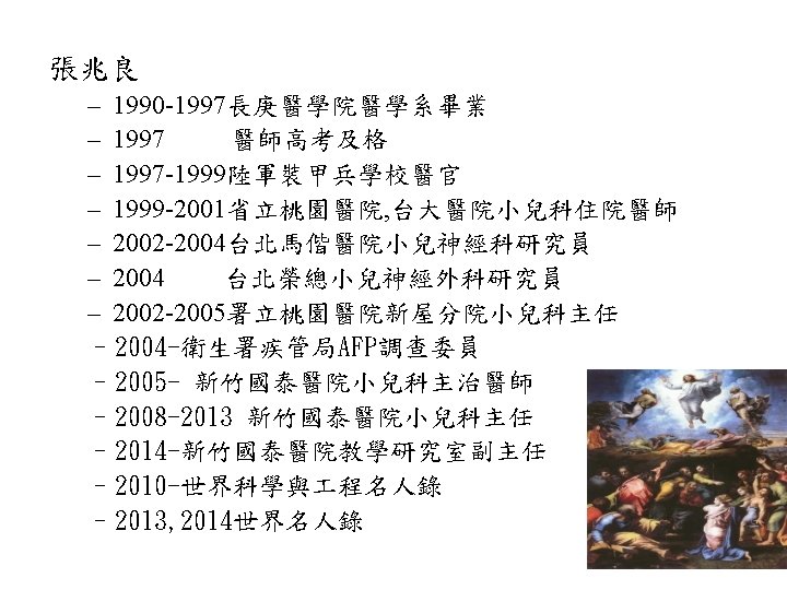 著作: • 1999: • 2006: • 2010: • 2011: 加護病房實戰手冊(合記圖書出版社) 臨床理學檢查(藝軒圖書出版社) 臨床理學檢查指引手冊(藝軒圖書出版社) Frontal horn cysts in normal neonates Developmental venous anomaly found by cranial US in a neonate Eye-of-the-Tiger sign is not Pathognomonic of Pantothenate Kinase-Associated Neurodegeneration in Adult Cases