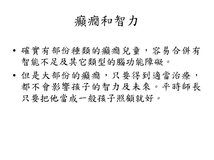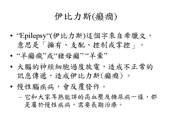 • 'Teacher, I brought my son to you, because he has an evil spirit in him and cannot talk. Whenever the spirit attacks him, it throws him to the ground, and he foams at the mouth, grits his teeth and becomes stiff all over. ' (Mark 9, 17 -18) 「老師,我帶了我的兒子來找你,因為有一隻啞 鬼附在他身上。鬼折磨他,使他常常摔在地上, 口吐白沫,咬牙切齒,全身僵硬。」
