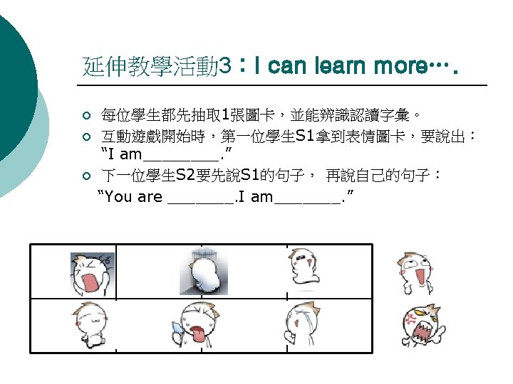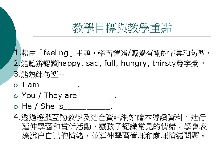 1I can say happy sad full hungry angry Slides: 6 Download presentation 教學活動 1:I can say…. happy sad full hungry angry crazy lucky thirsty 教學活動 2:I can read…. ¡I am _______. ¡ You are______. ¡ They are_____. ¡ He is_______. ¡ She is_______. happy sad full hungry angry crazy lucky thirsty
