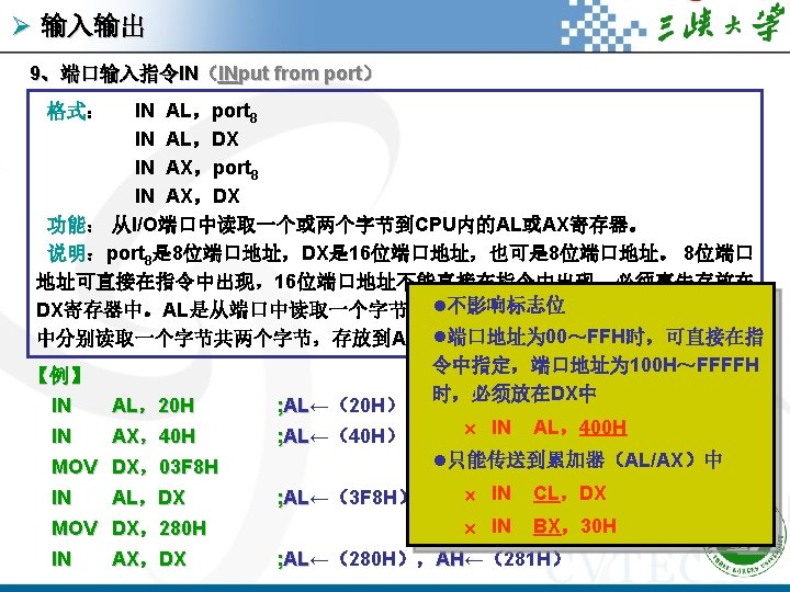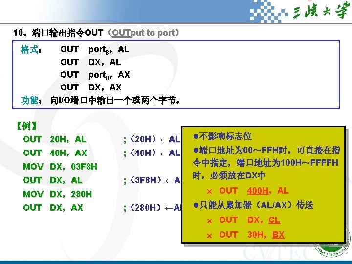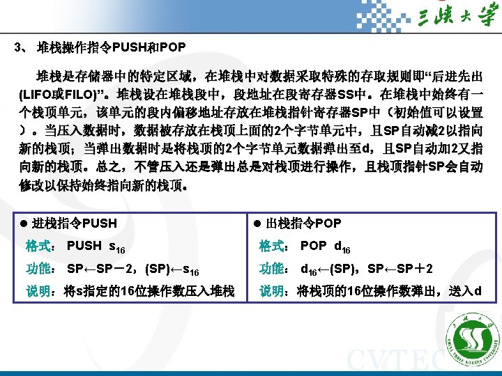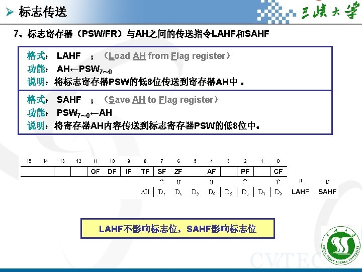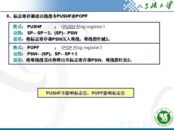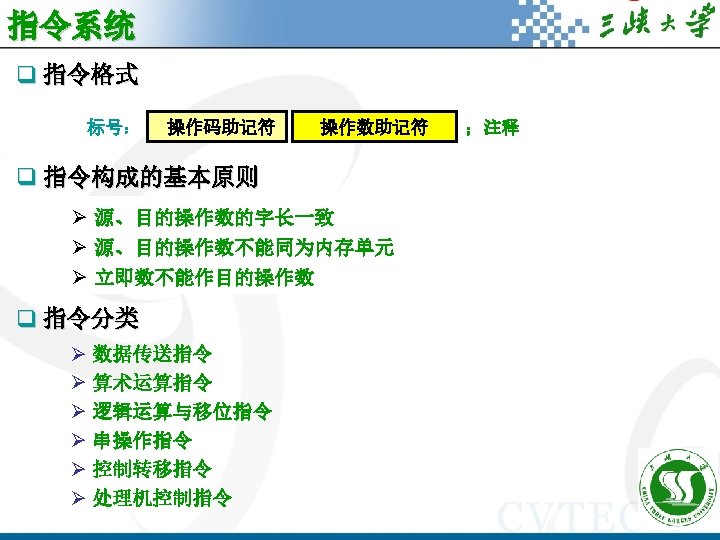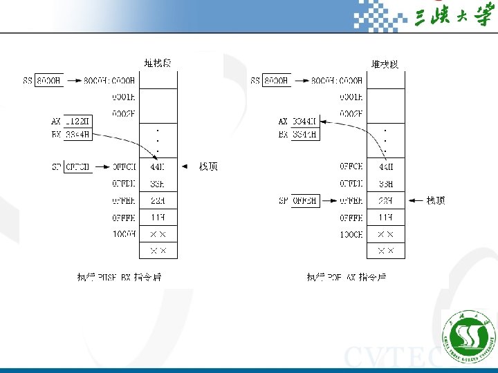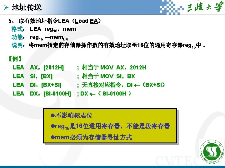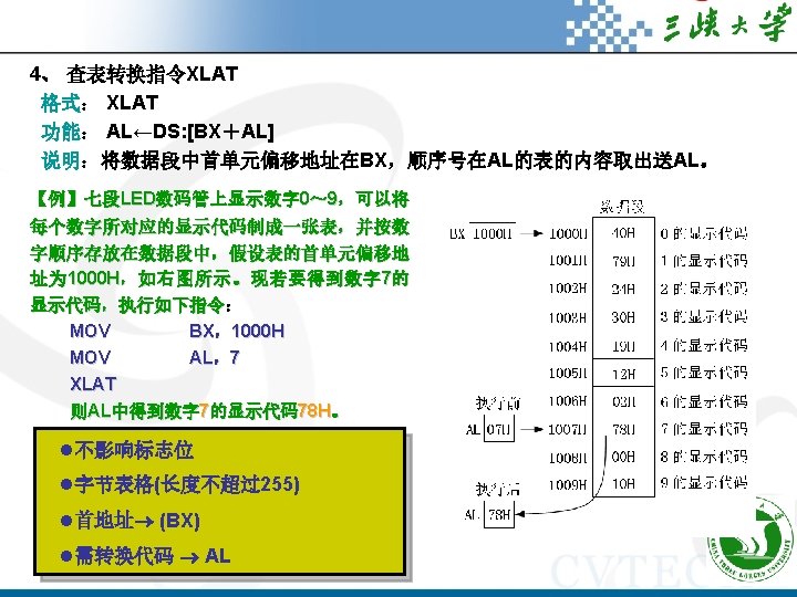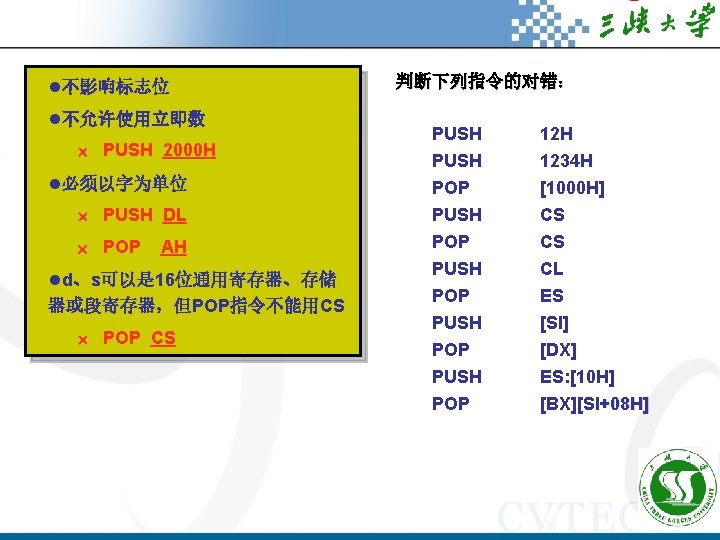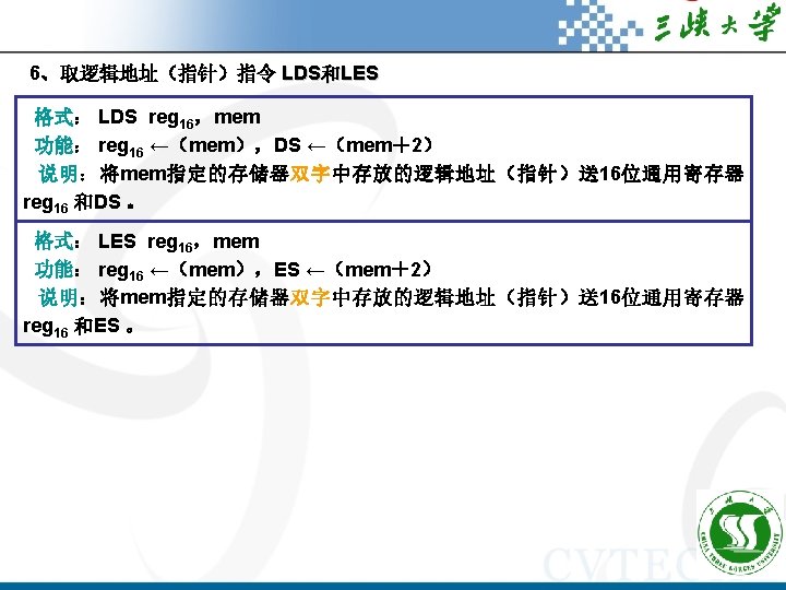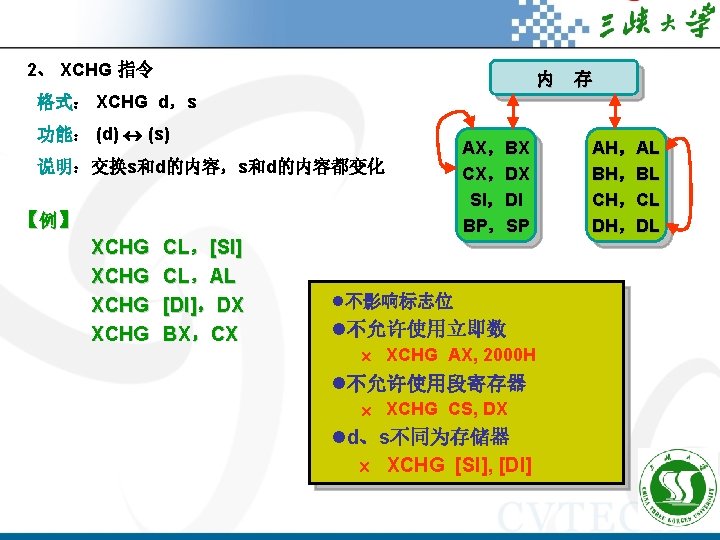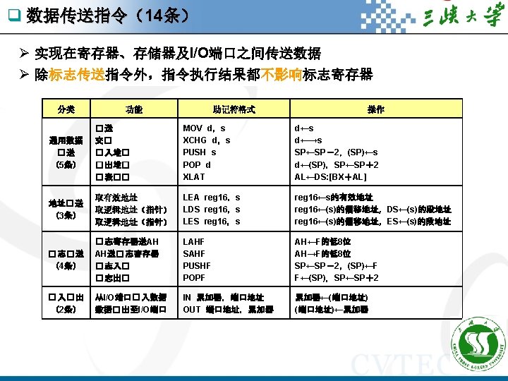 1MOV MOV ds d s sds MOV MOV Slides: 17 Download presentation Ø 通用数据传送 1、MOV指令 内 格式:MOV d,s 功能: (d) (s) 说明:将s的内容传送给d,s保持不变 【例】 MOV MOV MOV CS DS SS ES AX,BX CX,DX SI,DI BP,SP 存 AH,AL BH,BL CH,CL DH,DL AX,BX AH,DL CL,[SI] MOV AX,ES DS,SI MOV DS,AX 立即数 DI,[SI] [DI],DH l不影响标志位 CX,30 H ld不能是CS和立即数 BYTE PTR [SI],04 ld、s不同为段寄存器和存储器 [BX],CX MOV DS, ES WORD PTR [DI],100 H MOV AX,2000 H MOV DS,AX l立即数不能直接送段寄存器 MOV DS, 2000 H 【例】设SS= 8000 H,SP= 1000 H,AX= 1122 H,BX= 3344 H,执行以下指令: PUSH AX PUSH BX POP AX DS: 1000 H 0000 H SI,[2012 H] … … LDS (DI) SI 56 H 34 H 操作: SI (2013 H: 2012 H) DS (2015 H: 2014 H) LES DI,[2012 H] 操作: DI (2013 H: 2012 H) ES (2015 H: 2014 H) 2012 H 2013 H 2014 H 2015 H 34 H 56 H 78 H 9 AH 78 H DS (ES)