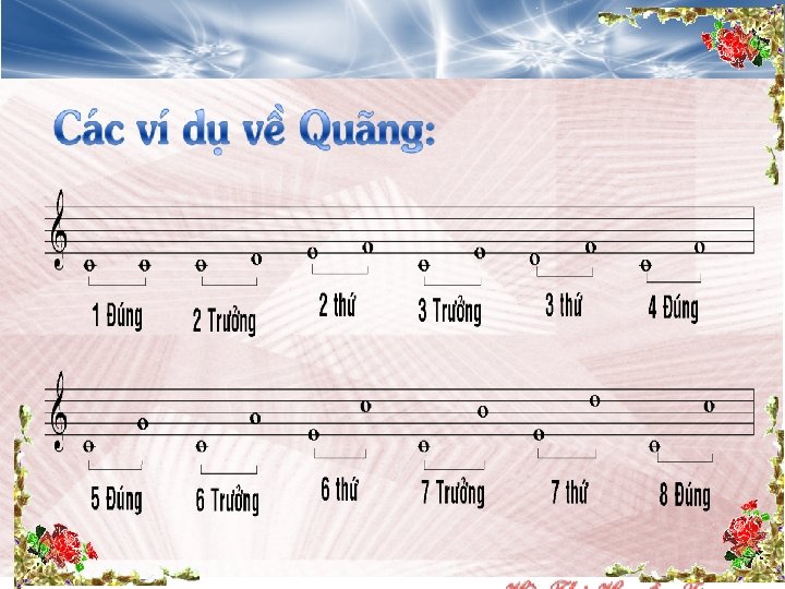 Như vậy để được gọi là quãng: +2 T : Phải có 2 bậc và bao gồm 1 cung +3 t : Phải có 3 bậc và bao gồm 1. 5 cung +4đ : Phải có 4 bậc và bao gồm 2. 5 cung +4 tă: Phải có 4 bậc và bao gồm 3 cung +5 g : Phải có 5 bậc và bao gồm 3 cung +…