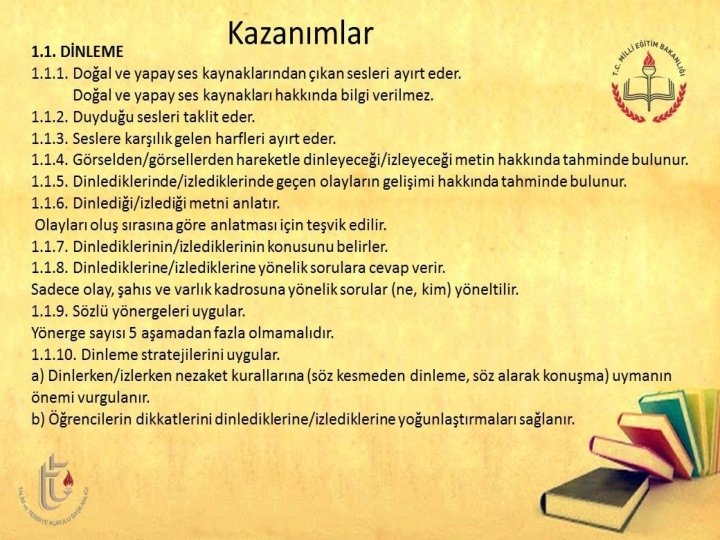 1 -İlk Okuma Yazmaya Hazırlık a)Dinleme Eğitimi (Bu eğitime ilk kez programda yer verilmektedir. Özellikle doğal ve doğal olmayan sesler üzerinden bir hazırlık yapılır. )
